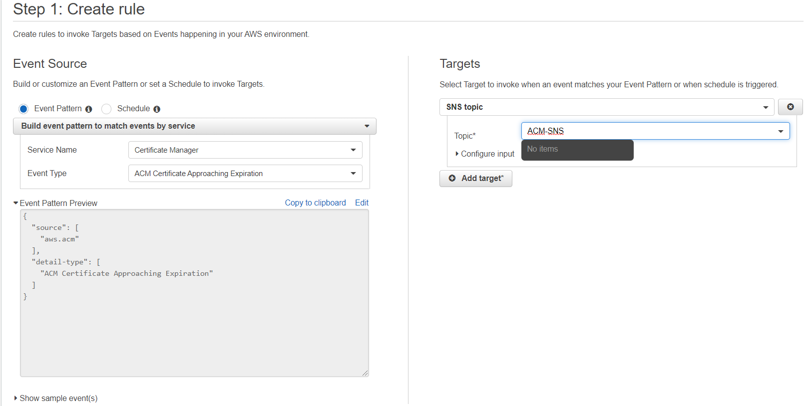 - AWS Web Console - CloudWatch - Rules - Create rule - Event pattern - Event by service - Certificate Manager -