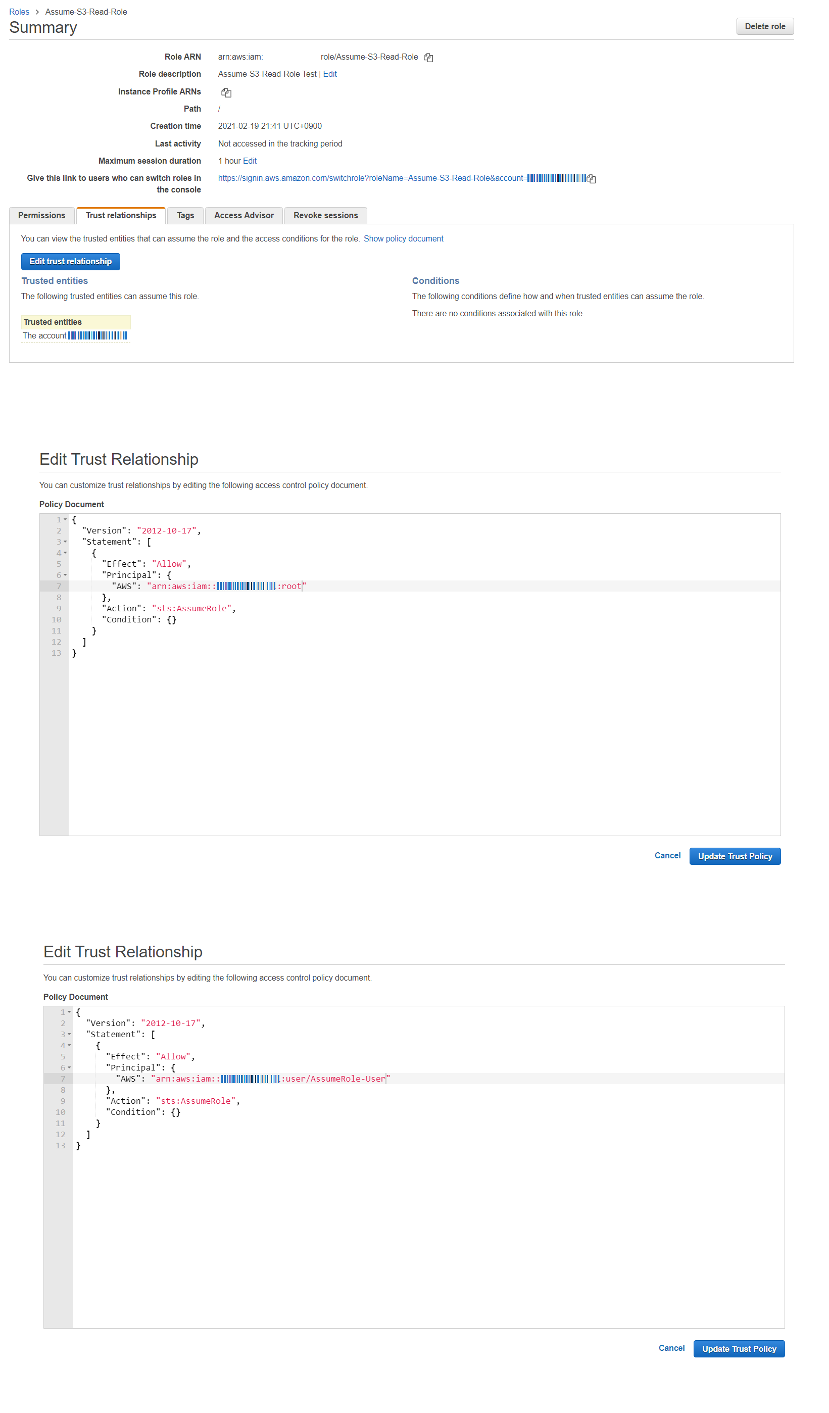 - Trust relationships - Edit trust relationship - root 부분을 user/AssumeRole-User 로 변경