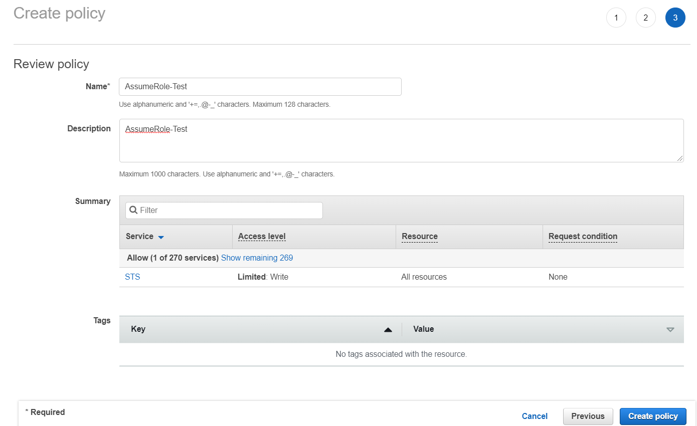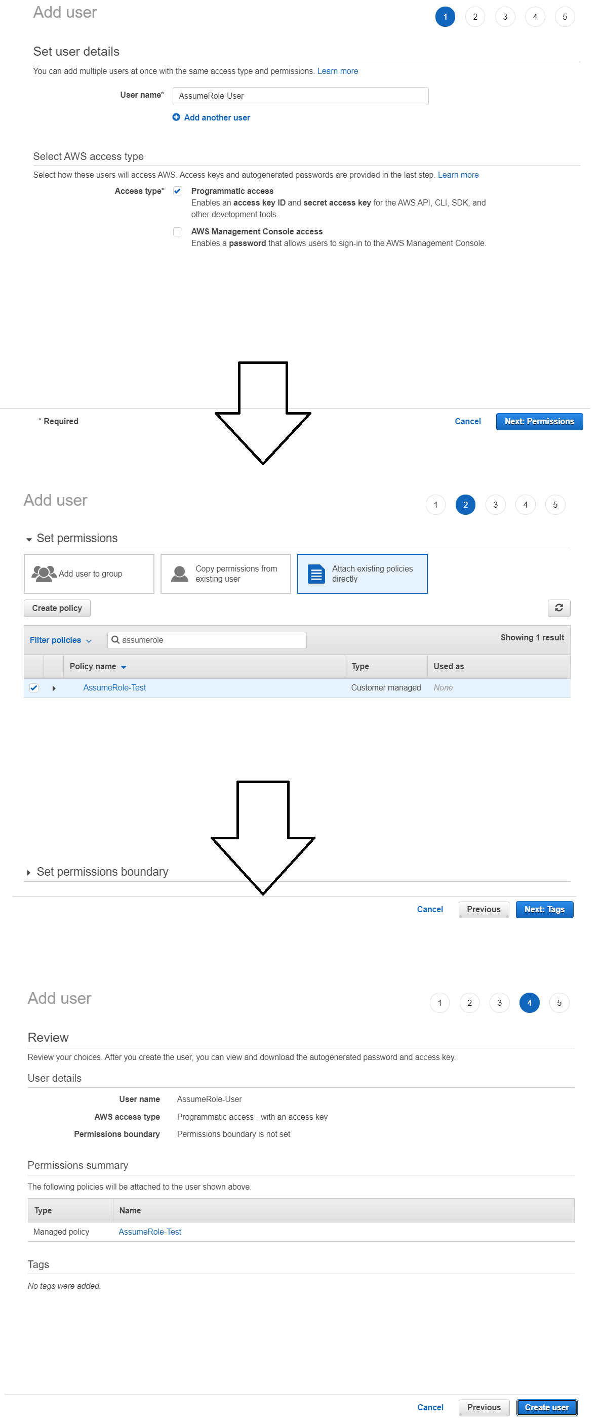 - AWS Web Console - IAM - Users - Create user - Programmatic access - AssumeRole-Test - Create user