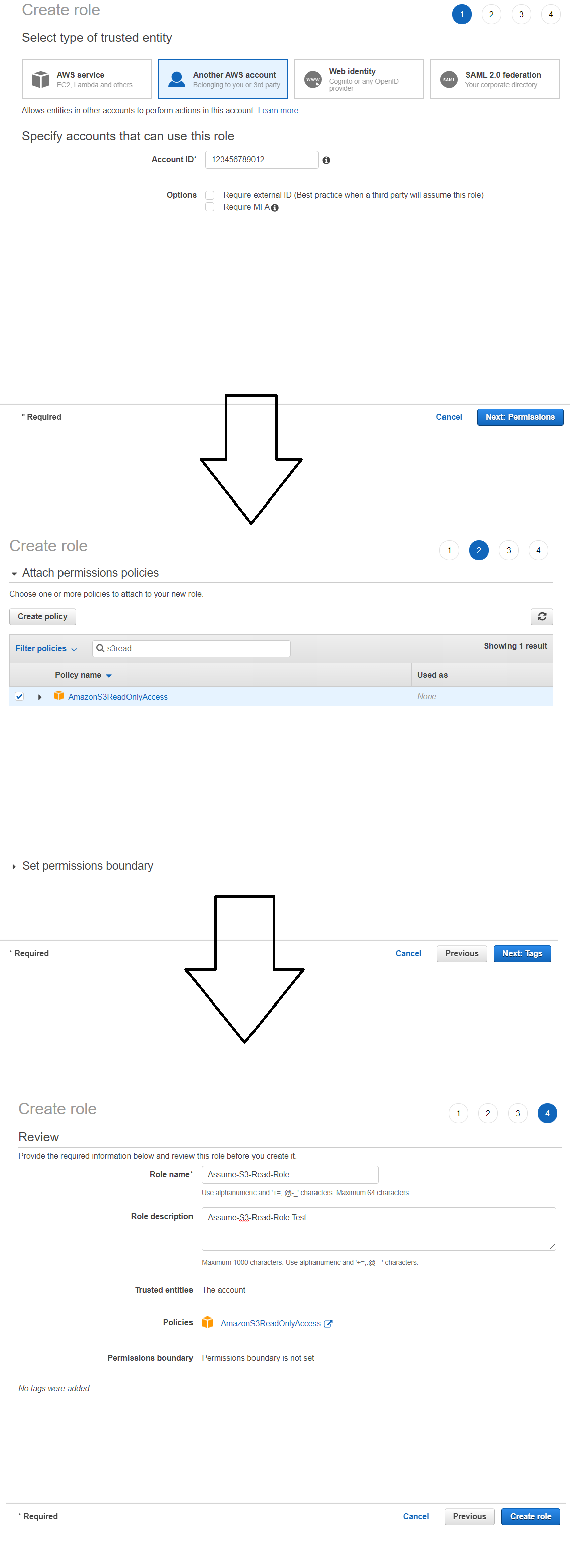 - AWS Web Console - IAM - Roles - Create role - Another AWS account - 자신의 12자리 계정 번호
