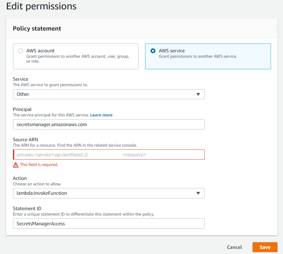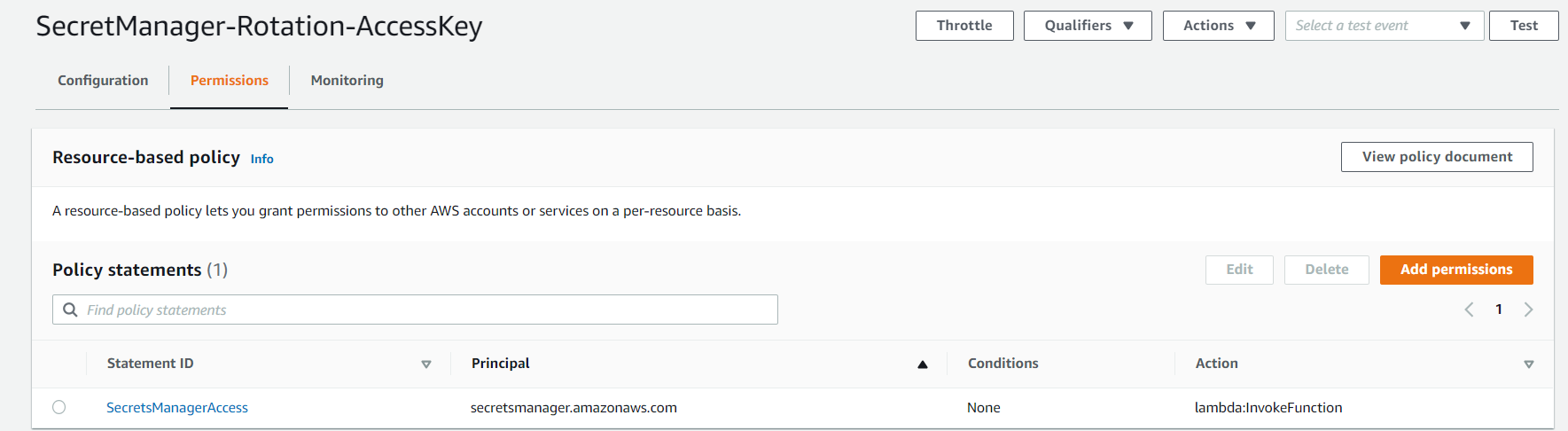 2-4. SecretsManager가 Lambda 함수를 사용할 수 있도록 Lambda에서 Resource-based-policy 생성.