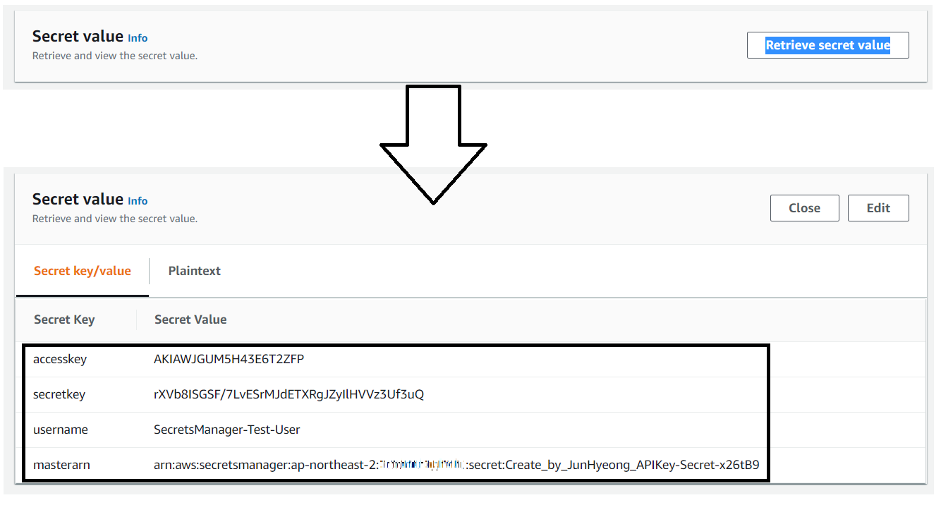 그럼.. 실제로 IAM User의 AccessKey가 교체되었는지는 Secret의 세부 정보에서 Secret value 값을 확인해보시면 됩니다.