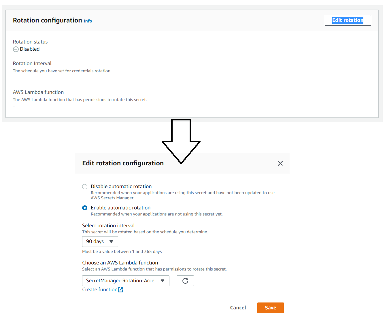 Lambda 함수를 연결해주고, SecretsManager가 연결된 Lambda 함수를 사용할 수 있도록 허용해주어야 합니다.