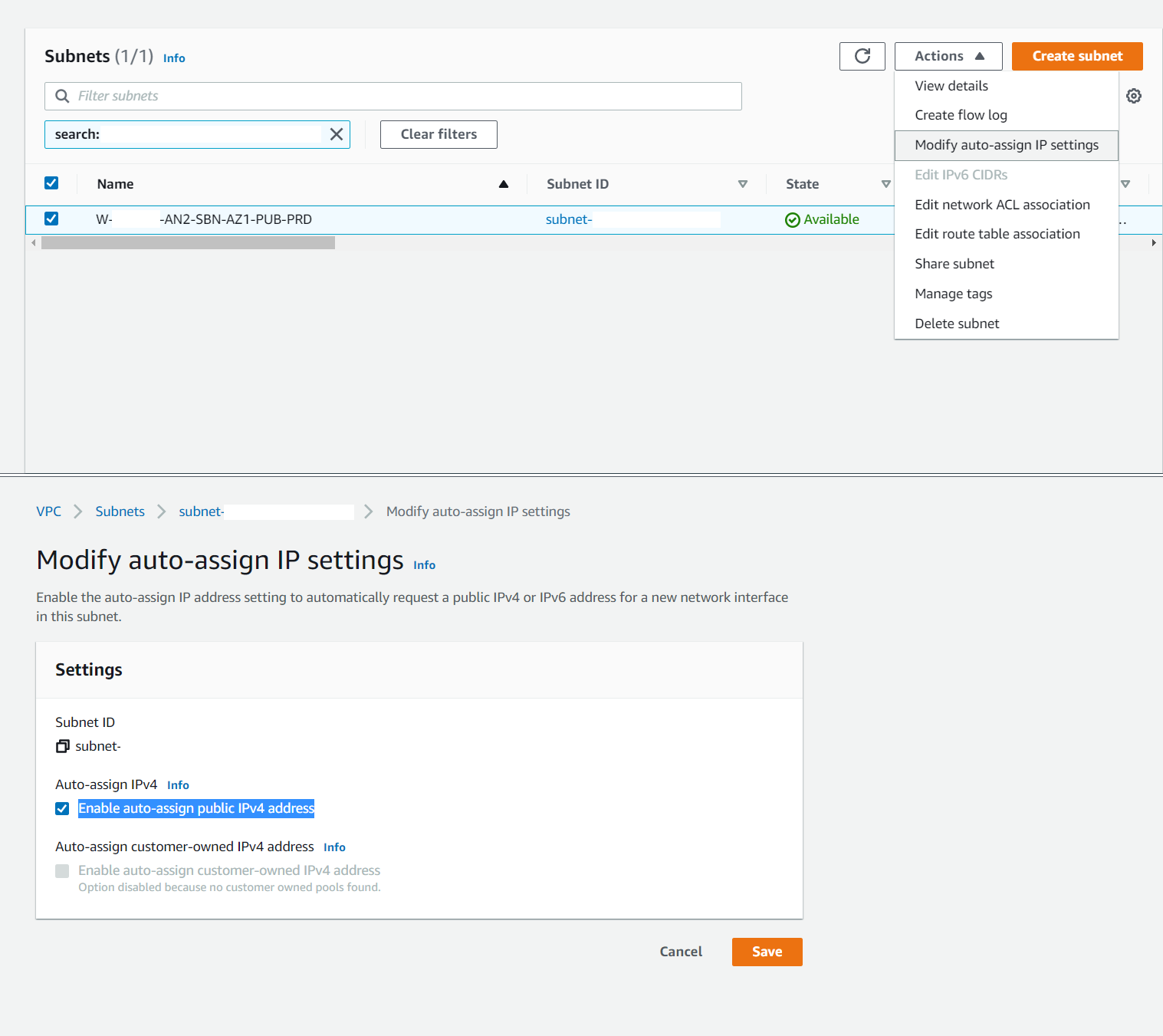 아래 사진은 Subnet에 Auto-assign Public IP를 셋팅하는 방법 입니다.