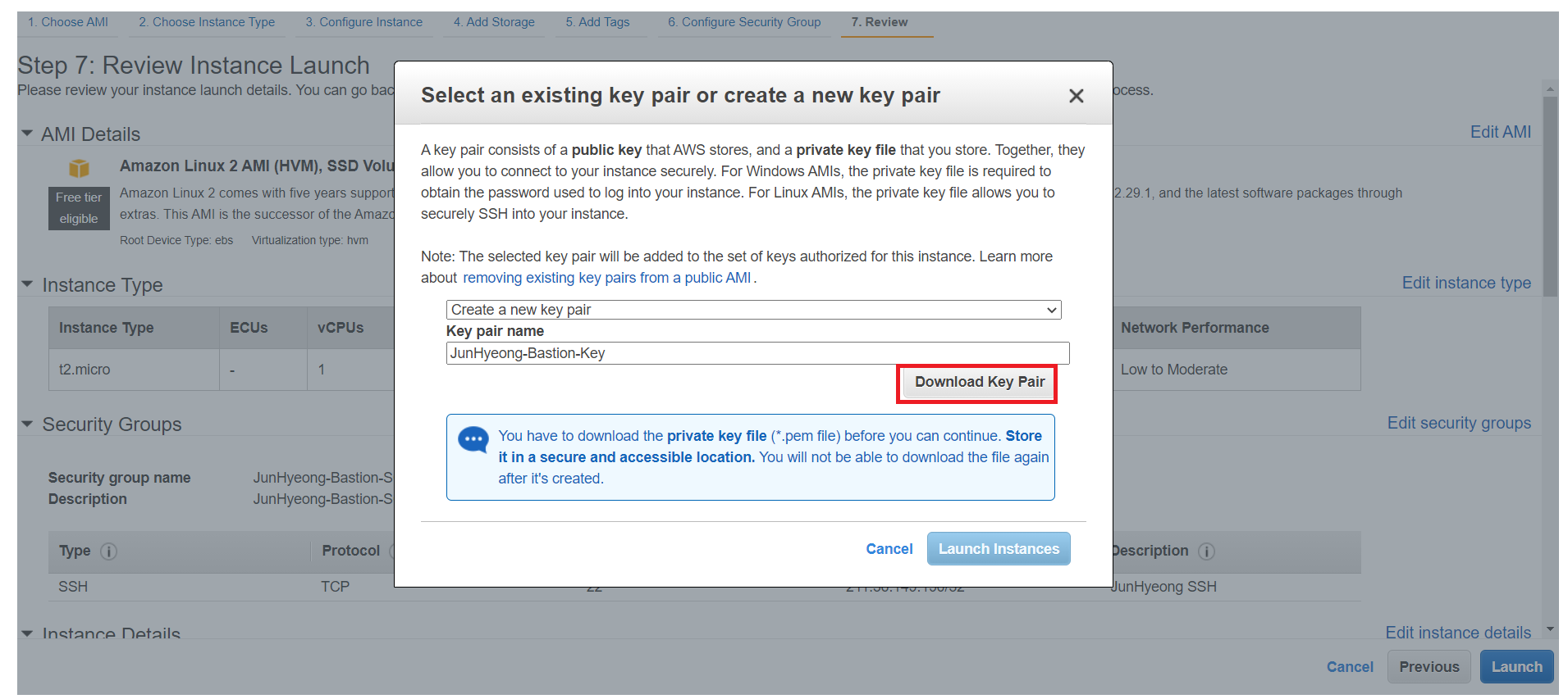 이후 Download Key Pair를 꼭!꼭!꼭! 눌러서 Key를 다운로드 받으셔야 합니다!!