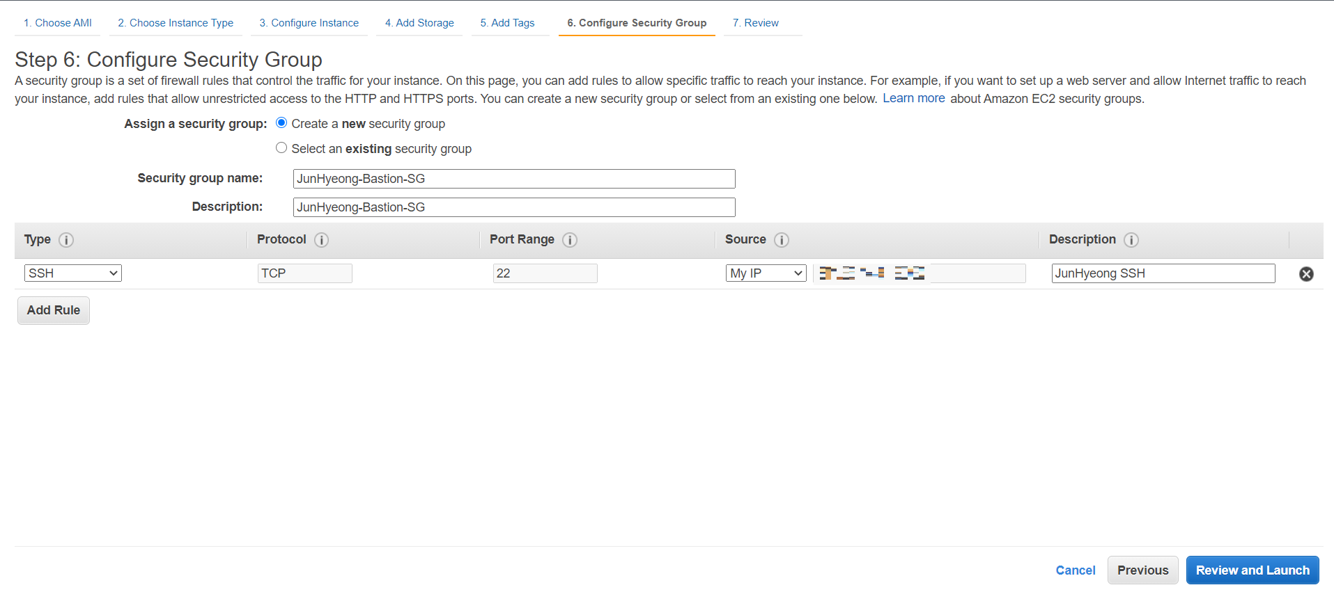 적절한 이름과 설명, 또한 Inbound rule에는 22번 Port로 My IP를 지정해주었습니다.