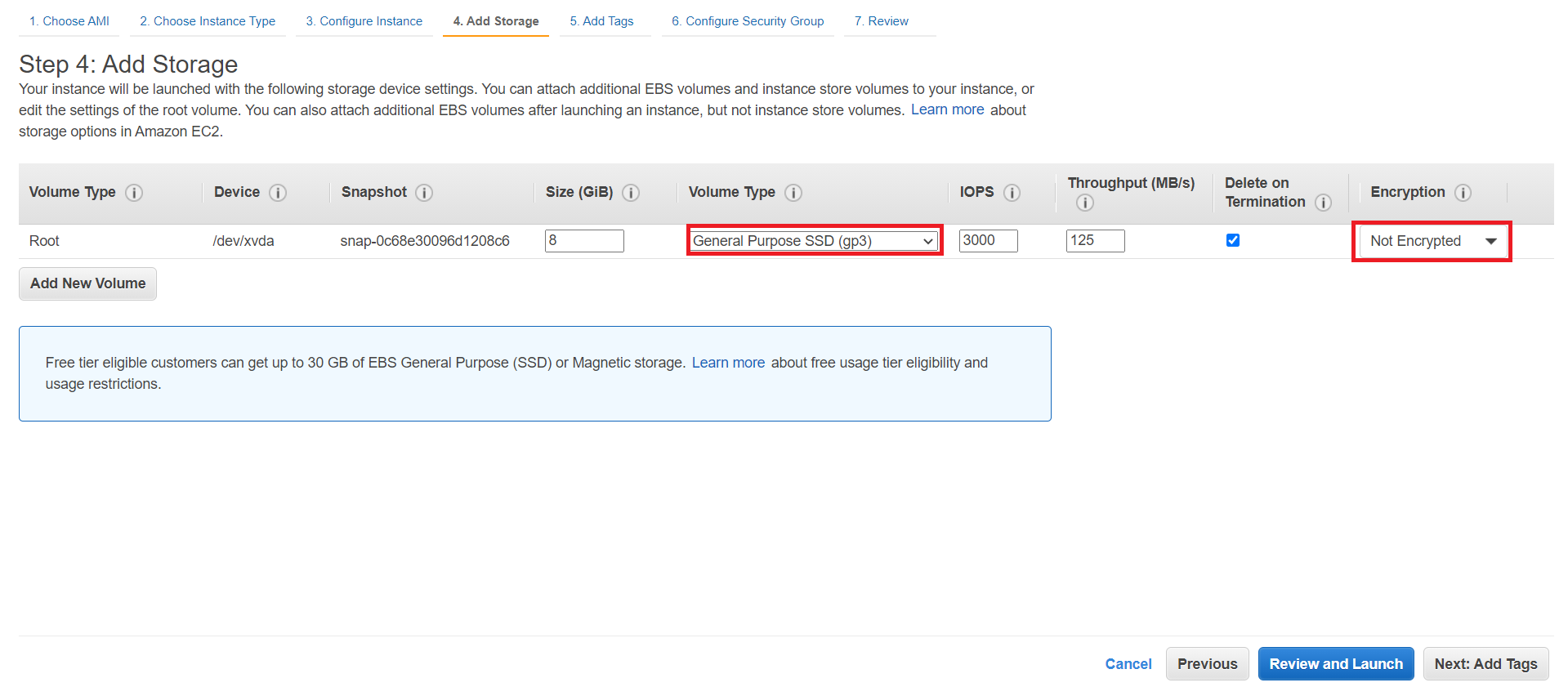 Default 설정으로 두시면 Size는 8GiB에 Volume Type이 gp2 일텐데요.