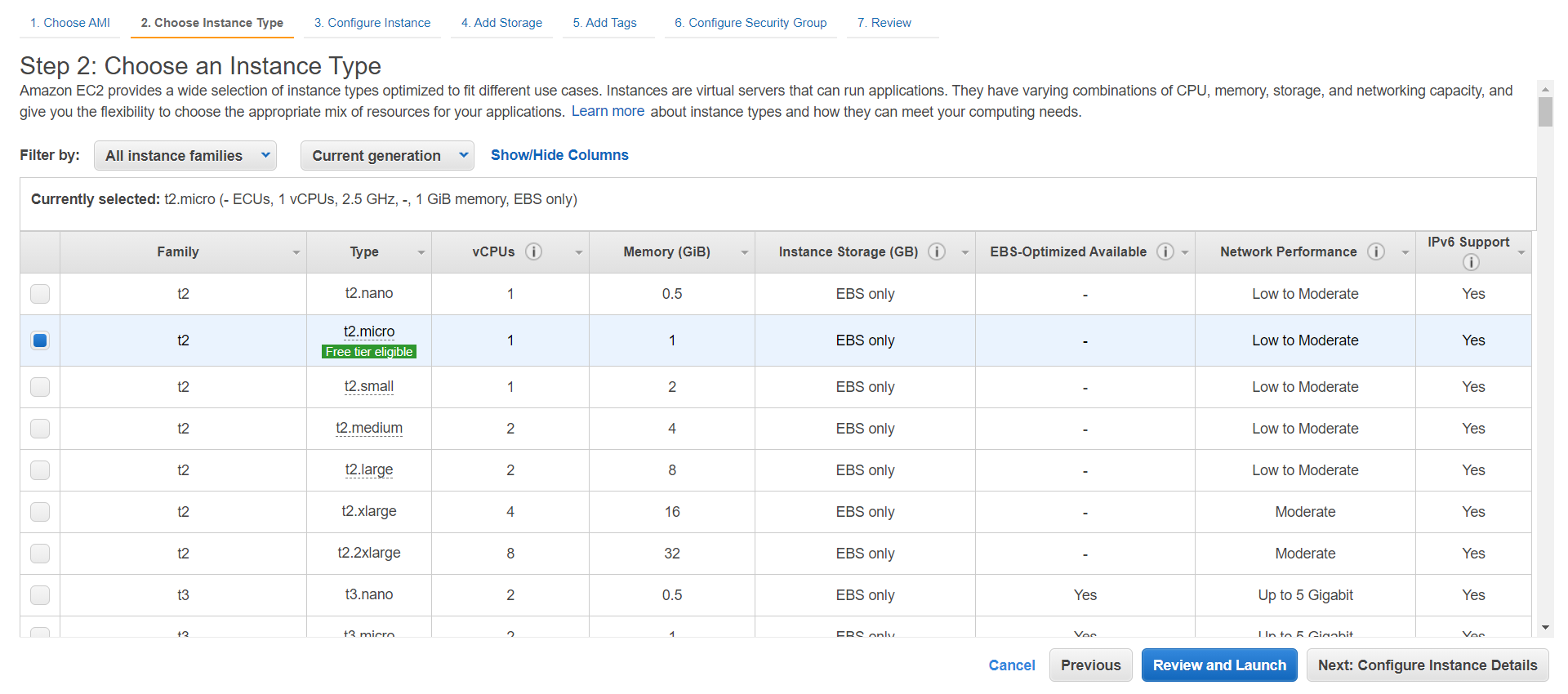 AMI를 선택하시면 t2.micro 부터해서 여러가지 타입들이 보이는데요.
