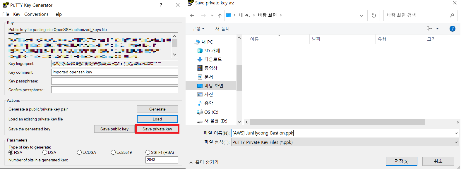 Load가 완료되면 Save private key를 눌러서 아래와 같이 알아보기 쉬운 이름으로 저장하시면 됩니다.