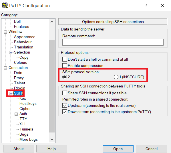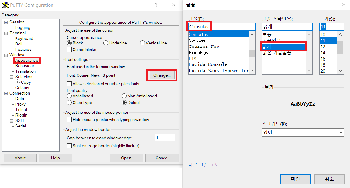 SSH 에서는 SSH Version 2를 사용하도록 체크해주시구요.