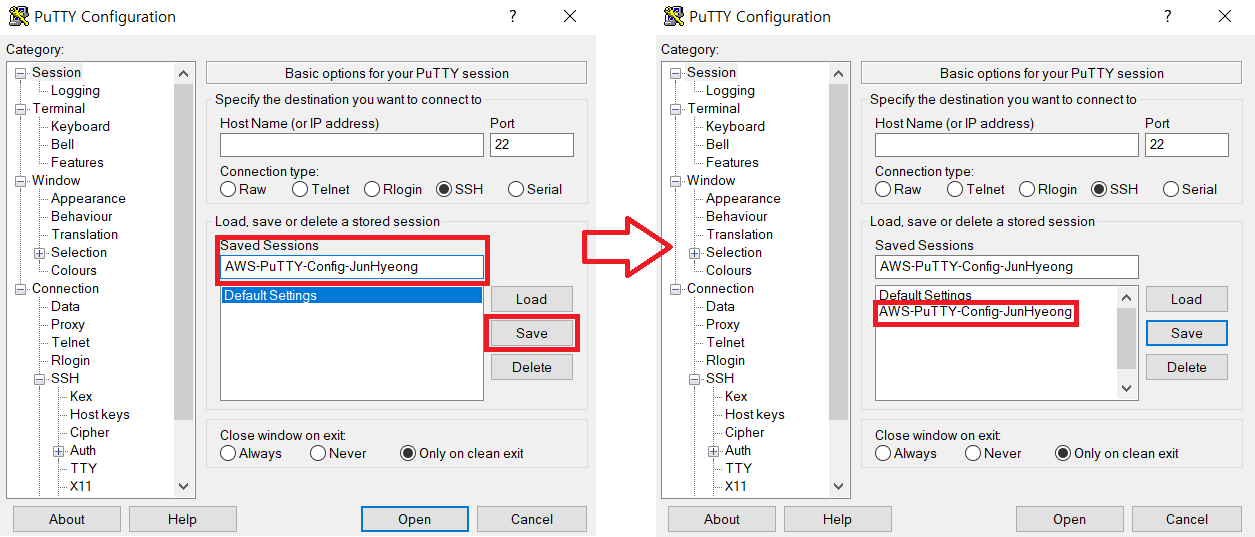 여기까지 설정을 하셨으면 다시 Session으로 돌아가셔서 Saved Sessions에 기억하기 좋은 임의의 이름을 입력하시고