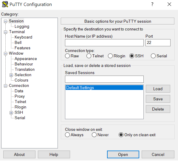 PuTTY.exe를 실행하면 아래와 같은 모습이실텐데요.
