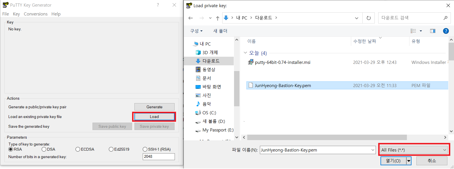 처음에 Load를 누르면 저 All Files가 .ppk 파일만 보이도록 되어있어 .pem 파일이 안보이실텐데요.