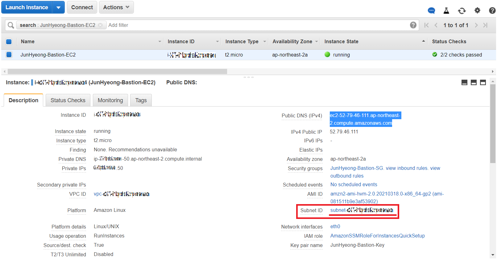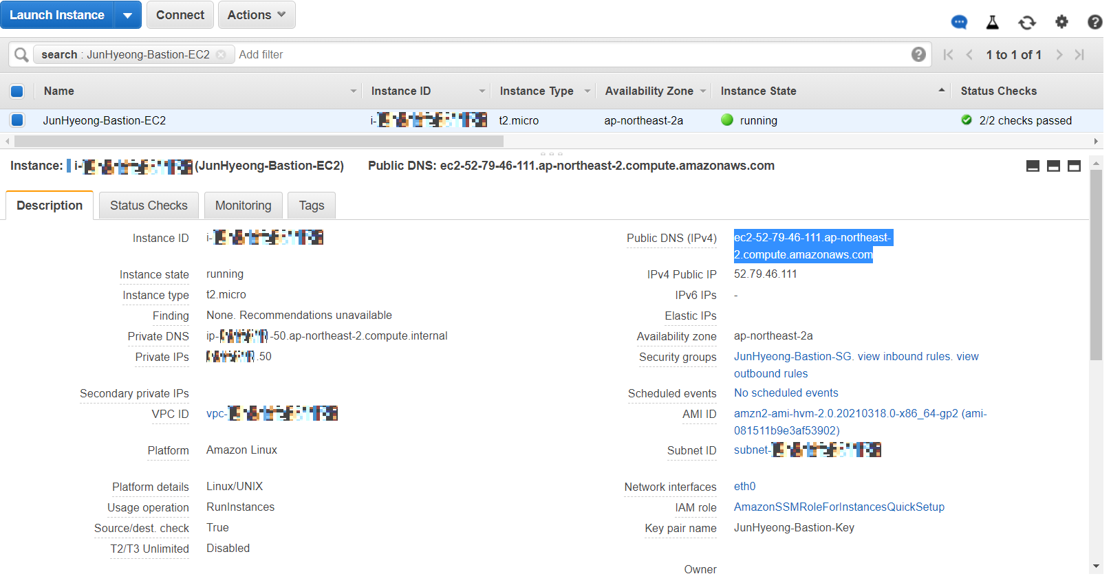 먼저 생성한 Bastion Instance의 Public DNS주소(or Public IP)를 알아내야합니다.