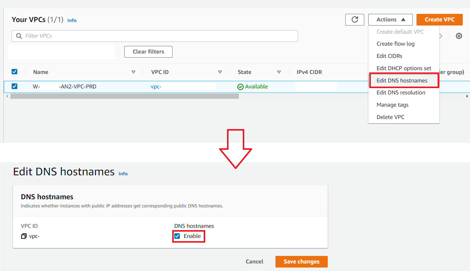 만약, Public DNS가 보이지 않으신다면..! VPC - VPC 선택 - Actions - Edit VPC hostnames - Enable 해주시고,