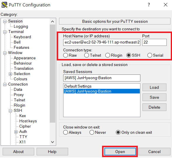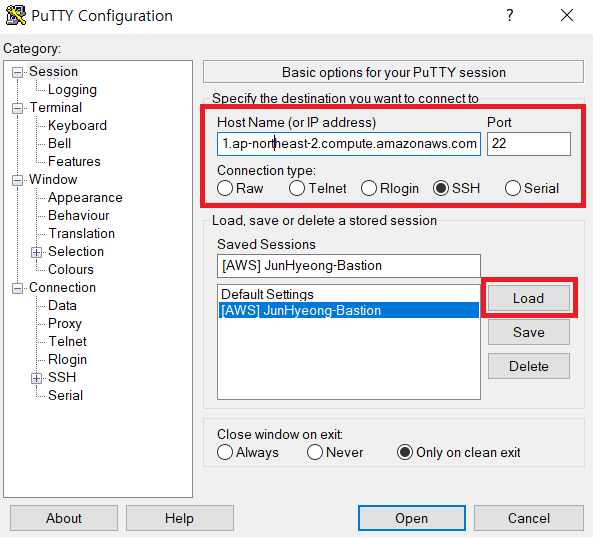 PuTTY를 실행하고 이전에 저장한 Session을 Load 해준 후, Host Name 쪽에 복사한 Public DNS를 붙여넣기 합니다.