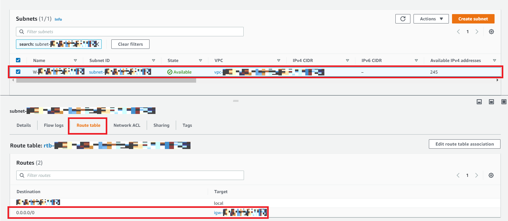 여기서 Subnet에 연결된 Routing table에 IGW로 나가는 규칙이 있는지 확인하시면 됩니다.