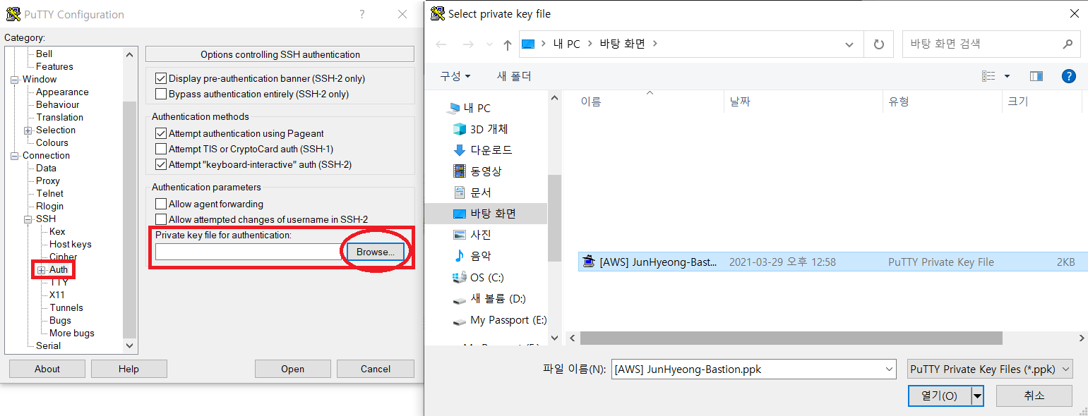 그리고, SSH - Auth에서 Private key file for authentication 쪽의 Browse를 눌러 이전에 저장한 ppk 파일을 불러옵니다.