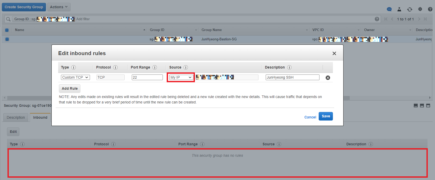 SG로 이동하여 Inbound rule을 확인하고, 규칙에 존재하지 않는다면 아래와 같이 넣어줍니다.