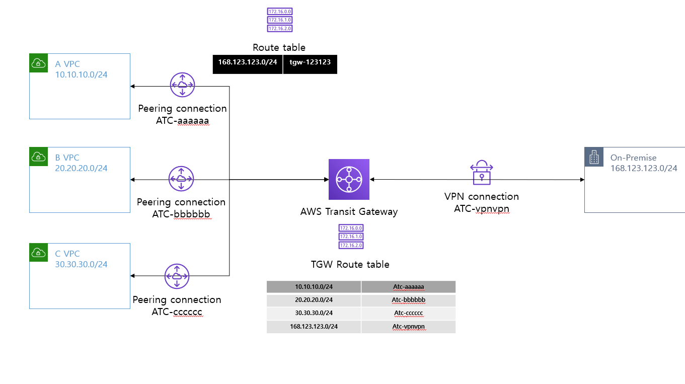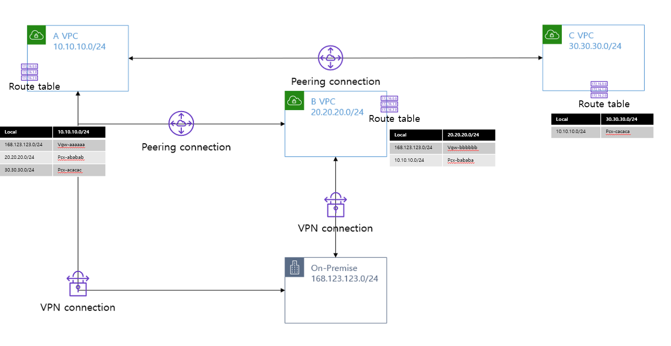 A, B, C 각각 3개의 AWS VPC가 존재하고, On-Premise가 존재한다고 가정하겠습니다.