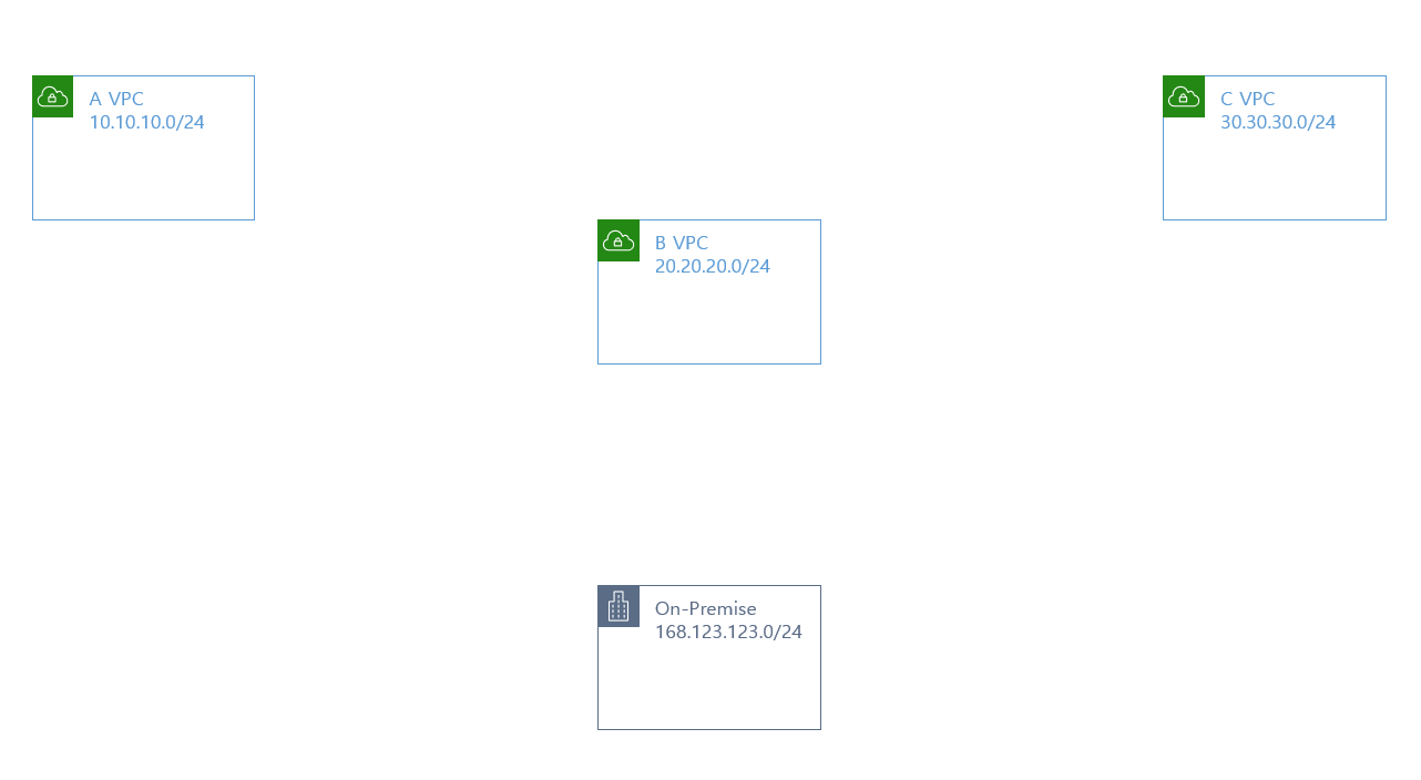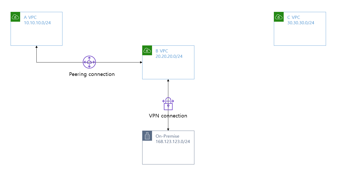 여기서, A VPC와 B VPC간의 통신요건이 발생했고, B VPC와 On-Premise간의 통신 요건이 발생했다고 가정하겠습니다.