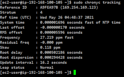 다음은 chrony가 169.254.169.123 주소를 사용하여 Time sync 중인지 확인합니다.