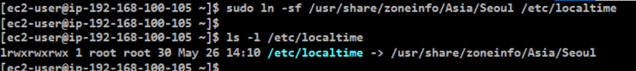 이후, Instance가 현지 시간 정보를 참조할 때 표준시간대 파일을 찾을 수 있도록 /etc/localtime과 표준시간대 파일 사이에 심볼 링크를 생성해줍니다.