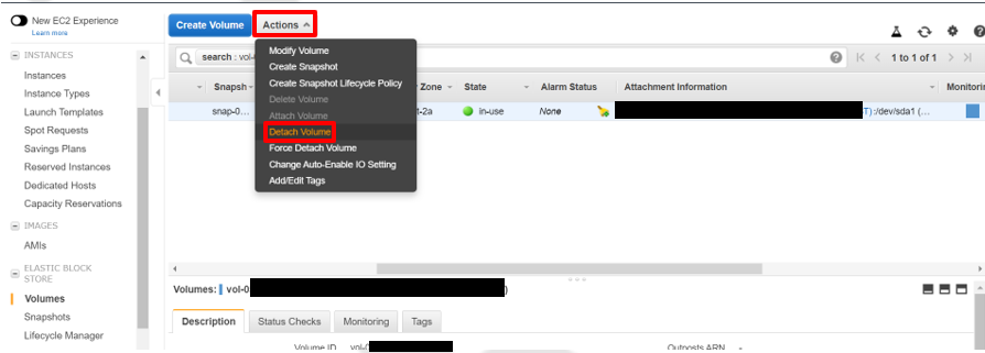 - 이 후, 해당 Instance에 연결된 EBS Root volume을 detach 합니다.