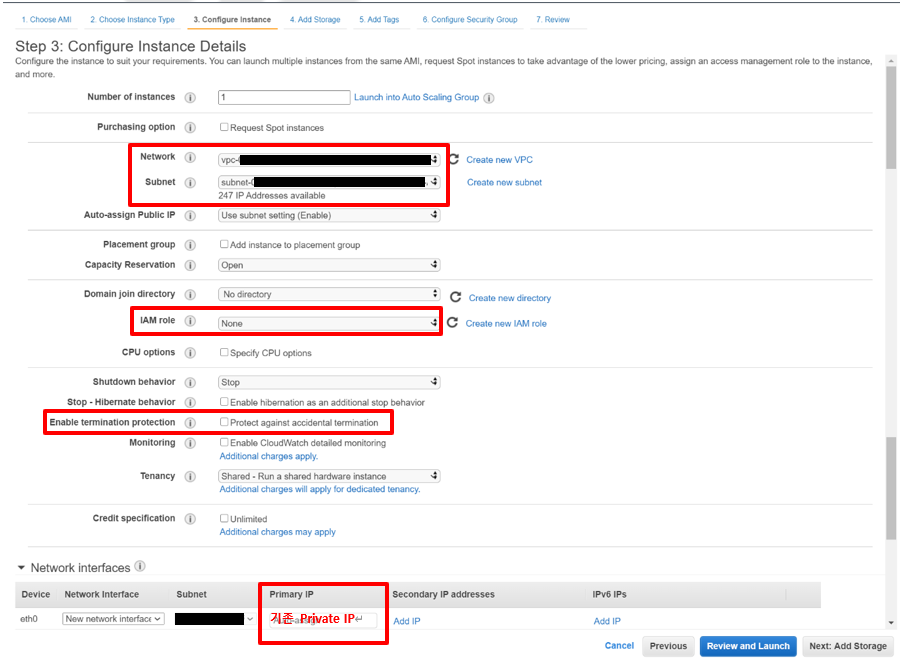 VPC, Subnet, IAM Role, PrivateIP, SG 등을 기록하여 작업해줍니다. - 필요에 따라서 해당 Instance의 종료방지기능(Termination Protection)기능을 Enable 해줍니다.(인재방지)