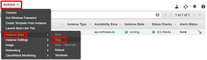 - Instance Launch 작업이 끝났다면, 해당 Instance를 Stopped(중지) 상태로 전환합니다.