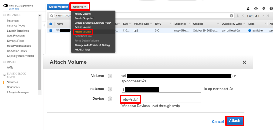Attach 해줍니다. 이 때, 기존의 Drive Path(Ex./dev/sda1)와 동일하게 설정합니다.
