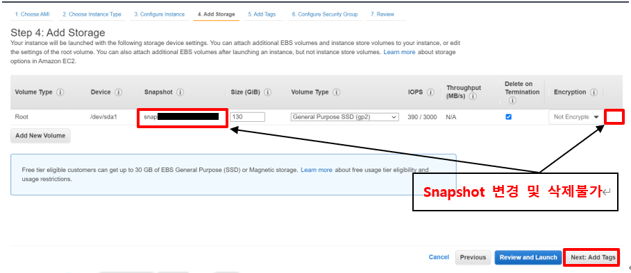 - 위에서 말씀 드린 것 처럼 Root volume은 Launch 과정에서 Snapshot을 변경할 수 없습니다.