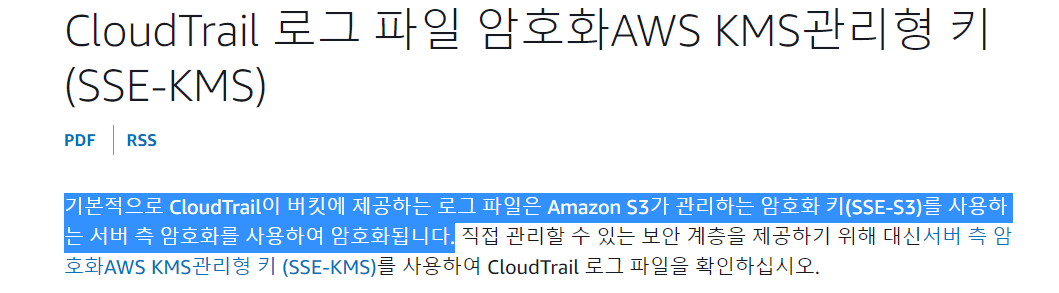 우선.. Docs부터 살펴보면.. CloudTrail은 기본적으로 SSE-S3키를 사용하는 서버측 암호화를 통해 암호화된다고 나와있는데요.