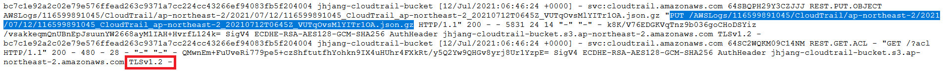 로그에서 확인하실 수 있듯이, CloudTrail이라는 Service가 PUT 작업을 실시했고, 암호 그룹과 함께 TLS 1.2 가 찍혀서 나오네요.