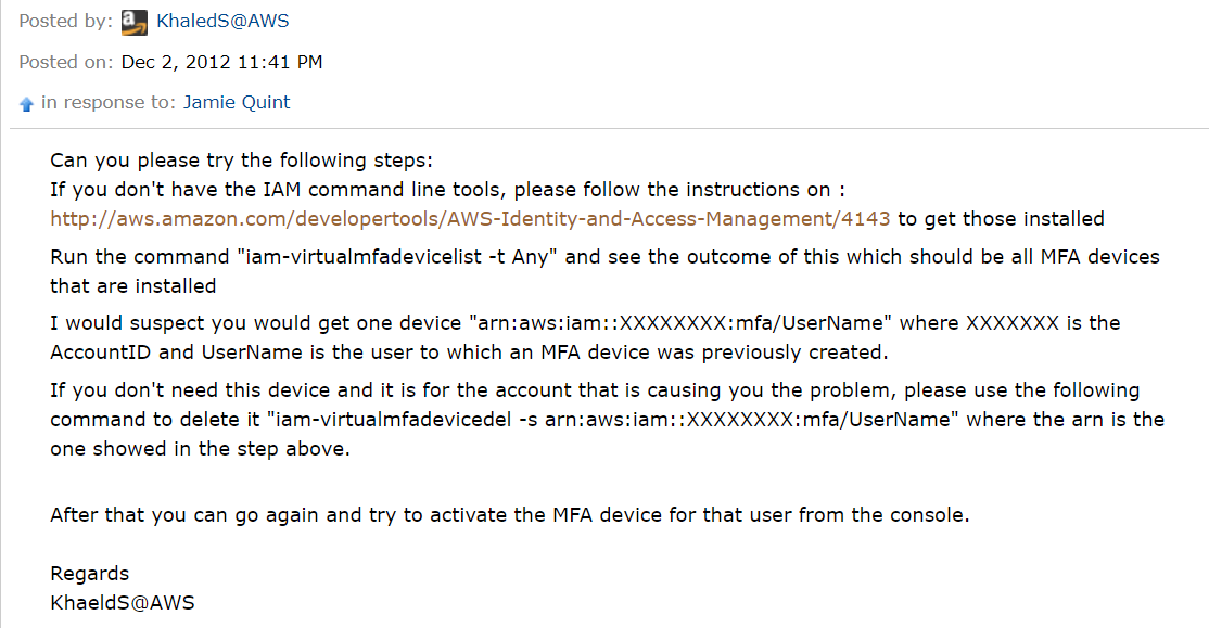 이 오류를 구글에 검색하면 한 AWS Developer Forums에 다음과 같은 댓글이 있습니다.