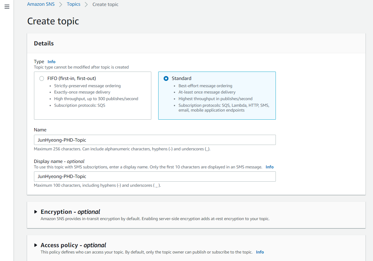 - AWS Web Console - SNS - Topic - Create topic - Standard Type