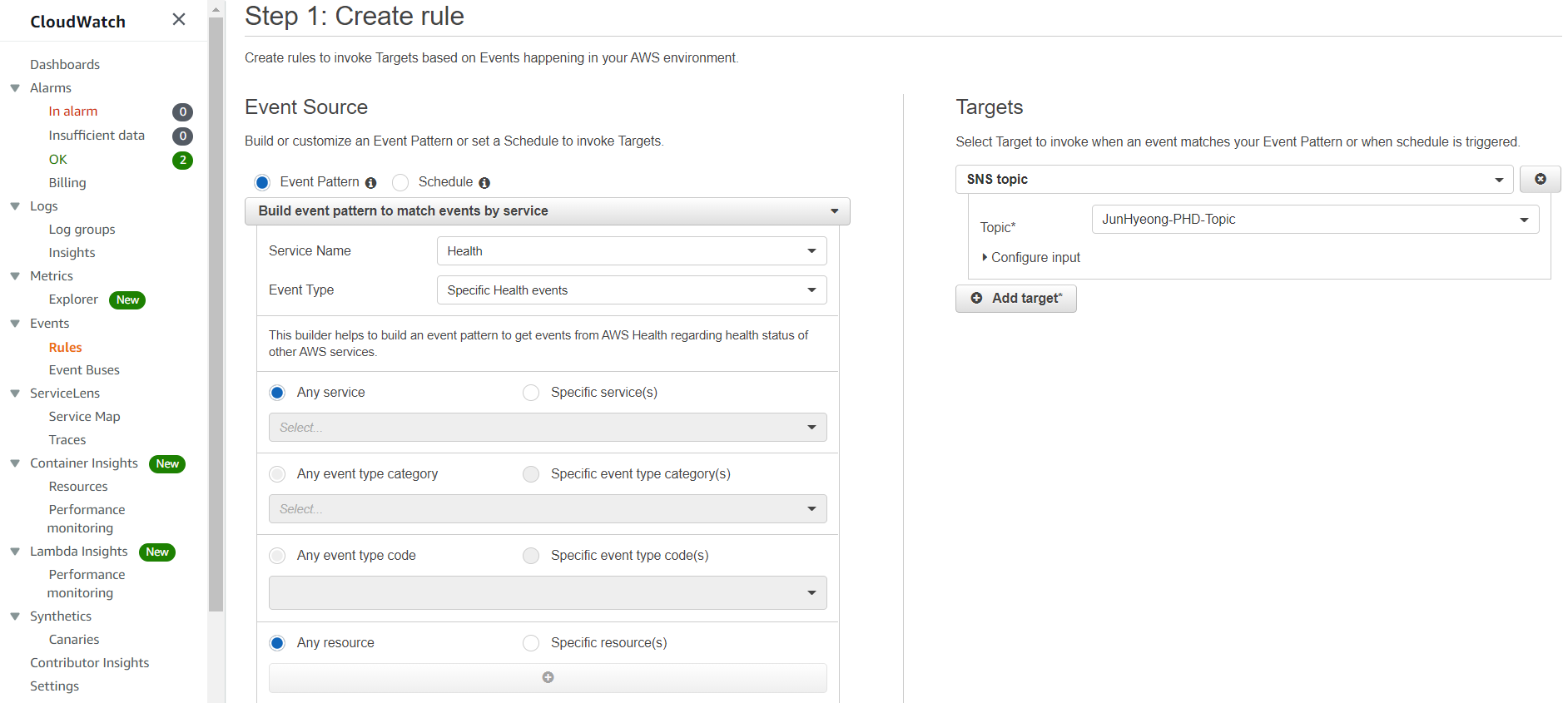 Specific Health Events - Any service - Any resouce - Targets에 위에서 생성한 SNS Topic 연결