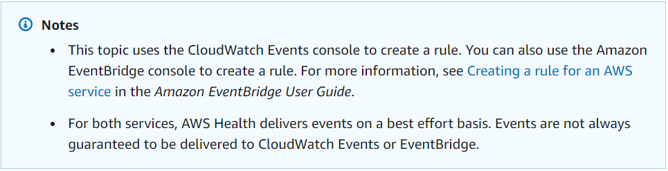 - AWS Web Console - CloudWatch - Rules - Create rule - Event pattern - Event by service - Health -